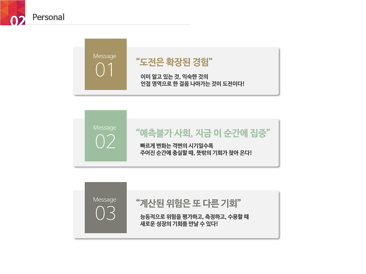 다만 도전에 대해 우리가 고려해야 할 부분은 아예 새로운 것을 시작하는 게 아니라 이미 알고 있는 것, 익숙한 것의 인접 영역으로 한 걸음 나아가는 것일 때 의미가 있다는 것입니다. 그 도전의 기회는 의도하지 않았을 때 찾아오는 경우가 많기 때문에 지금 우리가 할 일은 내가 지금 맡은 일, 지금 이 순간에 충실하는 일일 겁니다. 모든 것을 예측하고 그에 대비한다기 보다 오늘 내가 하는 일에서 가치를 만들어 내는 일에 집중하는 것이죠. 위험을 능동적으로 평가하고 받아들여 내가 성장할 수 있는 기회를 스스로 마련해 나가는 겁니다.
