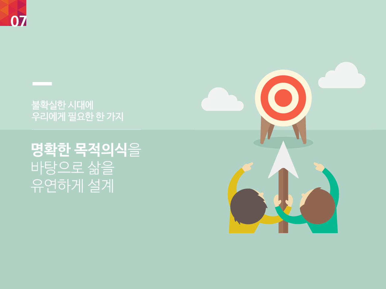 오늘 이야기를 정리하며 강조하고 싶은 이야기는 딱 한가지 입니다. 불확실성의 시대에서 명확한 목적 의식을 가지고 삶을 유연하게 설계하자, 그를 통해 융합의 가치를 만들어 내자는 겁니다. 중요한 것은 개인 차원에서는 경험, 회사 차원에서는 협력, 산업에서는 소비자 중심의 (개선이 아닌)파괴적 혁신이 중심이 된 융합이라고 저는 생각합니다. 이를 끝으로 오늘 이야기를 마무리 하고 싶습니다.