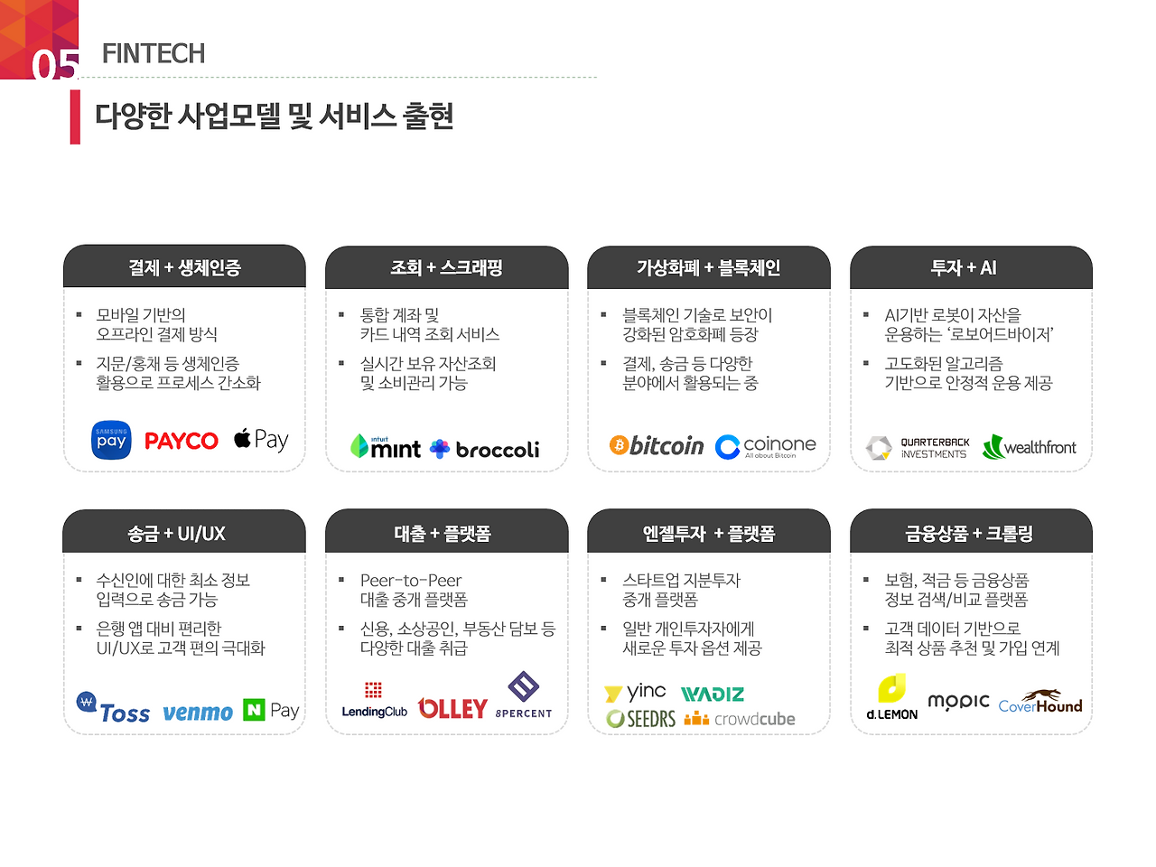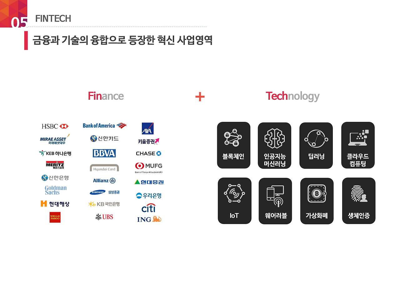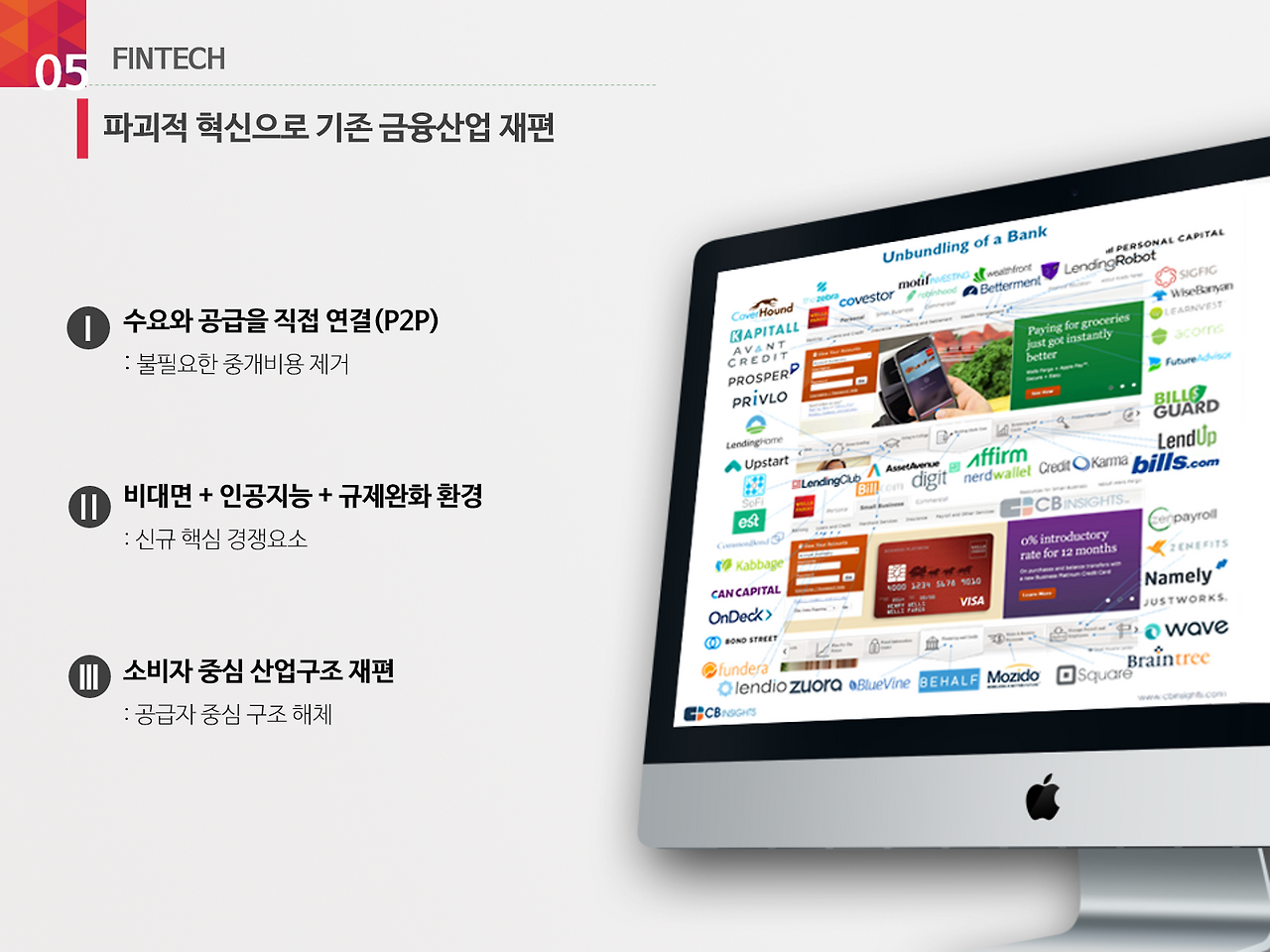 앞으로 금융 산업에서는 불필요한 중개 비용이 사라질 겁니다. 수요와 공급을 직접 연결할 테니까요. 또한 직접 대면할 필요없이 비대면으로, 인공지능을 통해 여러 프로세스의 효율을 높이면서(금융은 돈을 빌려주면 잘 갚을지, 투자를 하면 많이 벌 수 있을지, 카드를 발급해주면 많이 쓸 지 등 예측하는 비즈니스니까요), 규제가 완화되는 흐름을 타고 금융의 산업 구조는 소비자 중심으로 재편될 것입니다. 이 과정에서 가치를 만들어 낼 수 있는 핵심은 (고객의 수요와 욕구에 대응하는)융합에 있을 거고요.