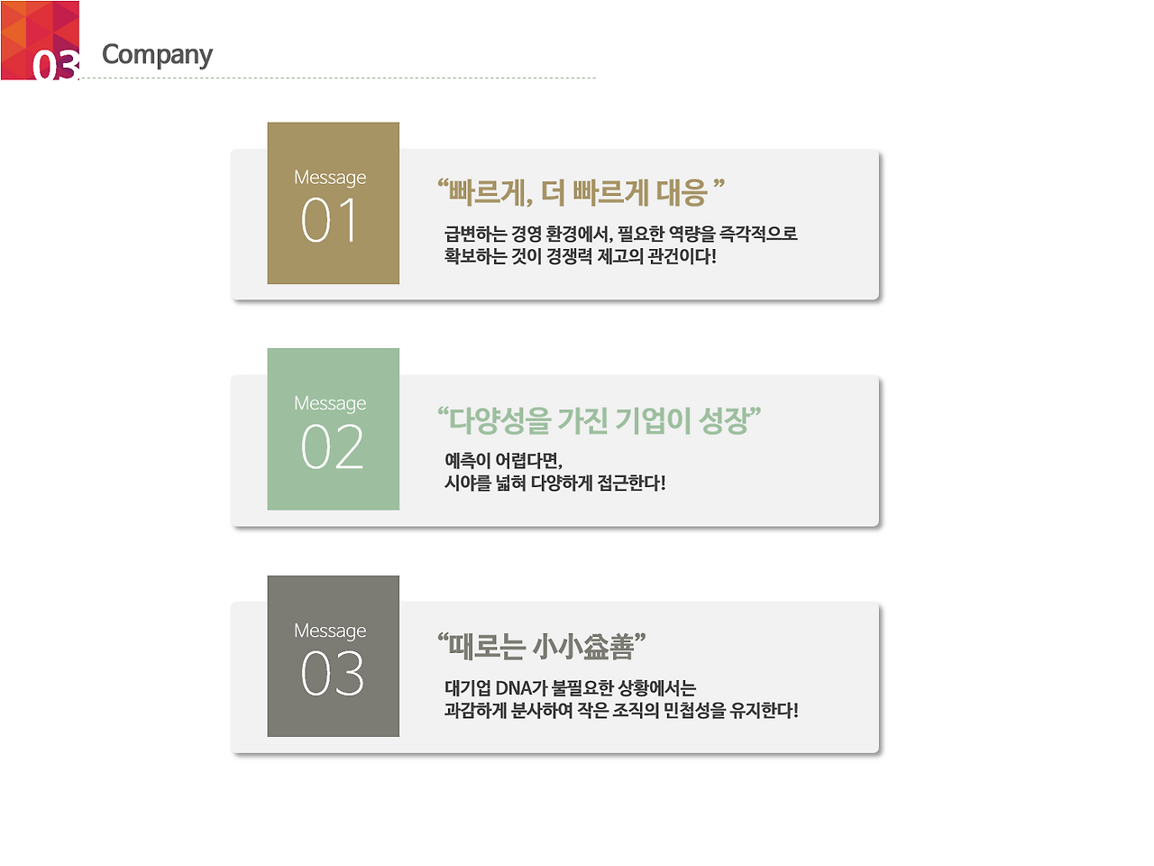 불확실성에 대비하기 위해 기업은 ‘빠르게 더 빠르게’ 대응하고 있습니다. 경영 환경이 급변하고 있기 때문에 시기에 따라 필요 역량을 즉각적으로 확보하는 것이 경쟁력 높일 수 있는 방법이기 때문입니다. 또한 다양성을 가진 기업이 성장하고 있습니다. 예측이 어렵기 때문에 시야를 넓혀 다양하게 접근한다는 논리인데, 불확실성이 큰 현 사회에서는 크게 하나가 움직이는 것보다 작게 여럿이 가는 것이 훨씬 경쟁력 있는 접근일 겁니다. 분사를 통해 작은 조직의 민첩성과 사업부의 오너십을 유지하게 하는 것도 같은 이유에서죠.