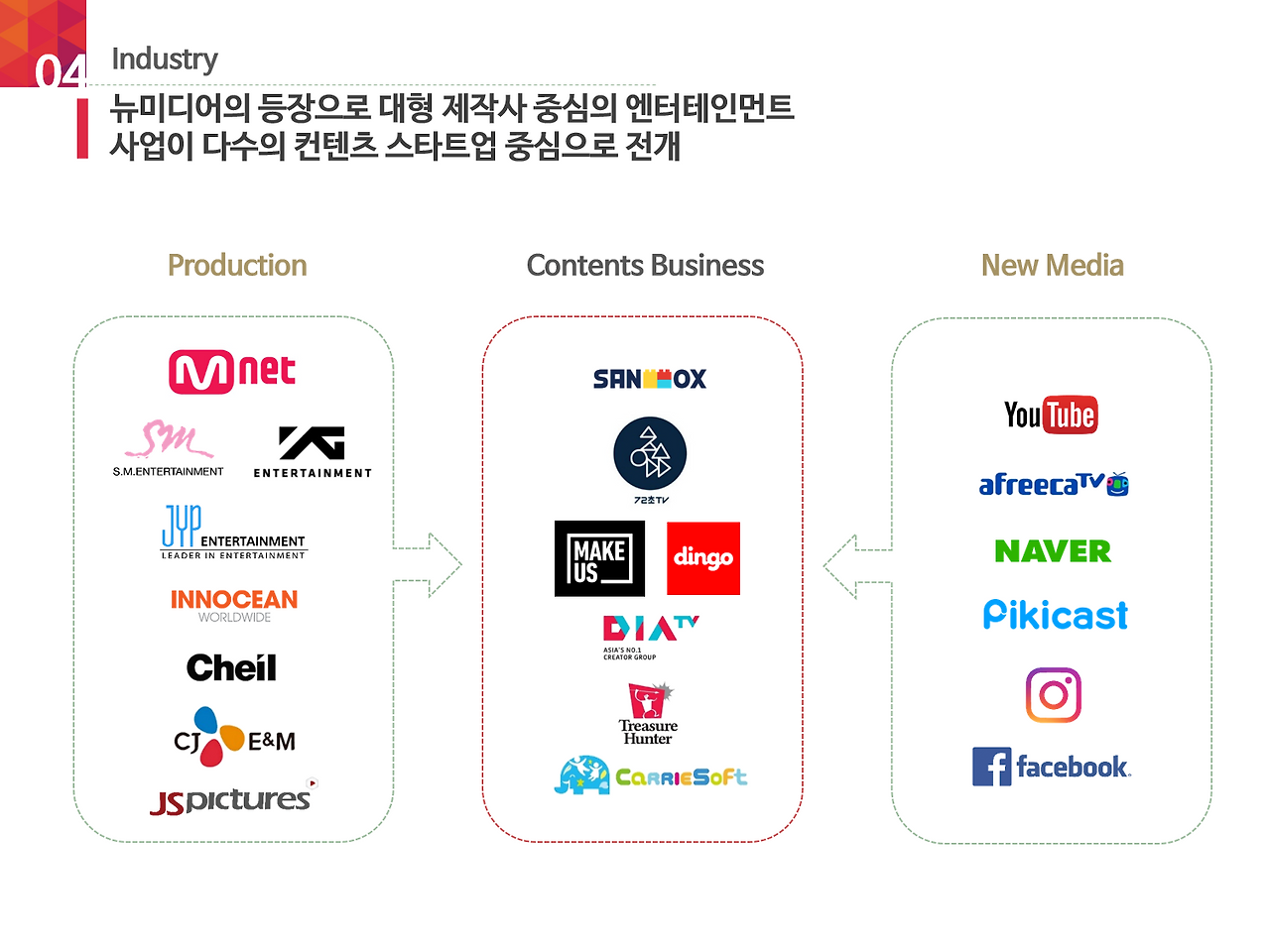 기존 엔터테인먼트 산업은 TV 중심의 전통 미디어에 기반해 성장했습니다. 고객 접점 확보를 위해 유통 채널을 선점하는 것이 중요한 분야였죠. 그리나 뉴미디어의 등장으로 신규 사업 영역이 생겨났습니다. 결과적으로 72초TV, 딩고, 다이아TV 등 뉴미디어 환경에 최적화된 콘텐츠를 생산하는 사업이 성장했고, 뉴미디어를 통해 활동하는 스타(크리에이터)를 관리하는 매니지먼트사도 등장하고 있습니다.