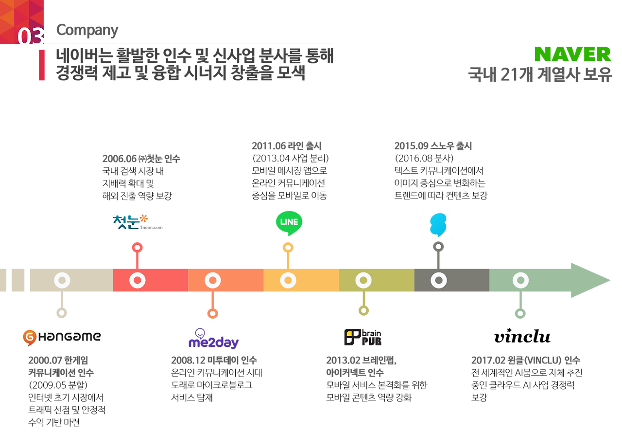 이제는 글로벌 기업이 된 네이버가 현재의 모습이 되기까지는 많은 변화들이 있었습니다. 고객의 반응을 예측하기 어렵고 빠르게 변하는 인터넷 환경에서 네이버는 적절한 인수와 발 빠른 신사업 개발로 대응해 사업을 성공시켰죠.