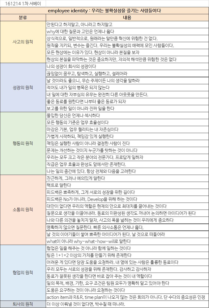경영진 역시 이런 이유로 시일이 걸리더라도 구성원들이 의견이 모여, 'top-down' 보다는 'bottom-up'의 형태로 코드가 정립되면 좋겠다는 가이드를 주었습니다.