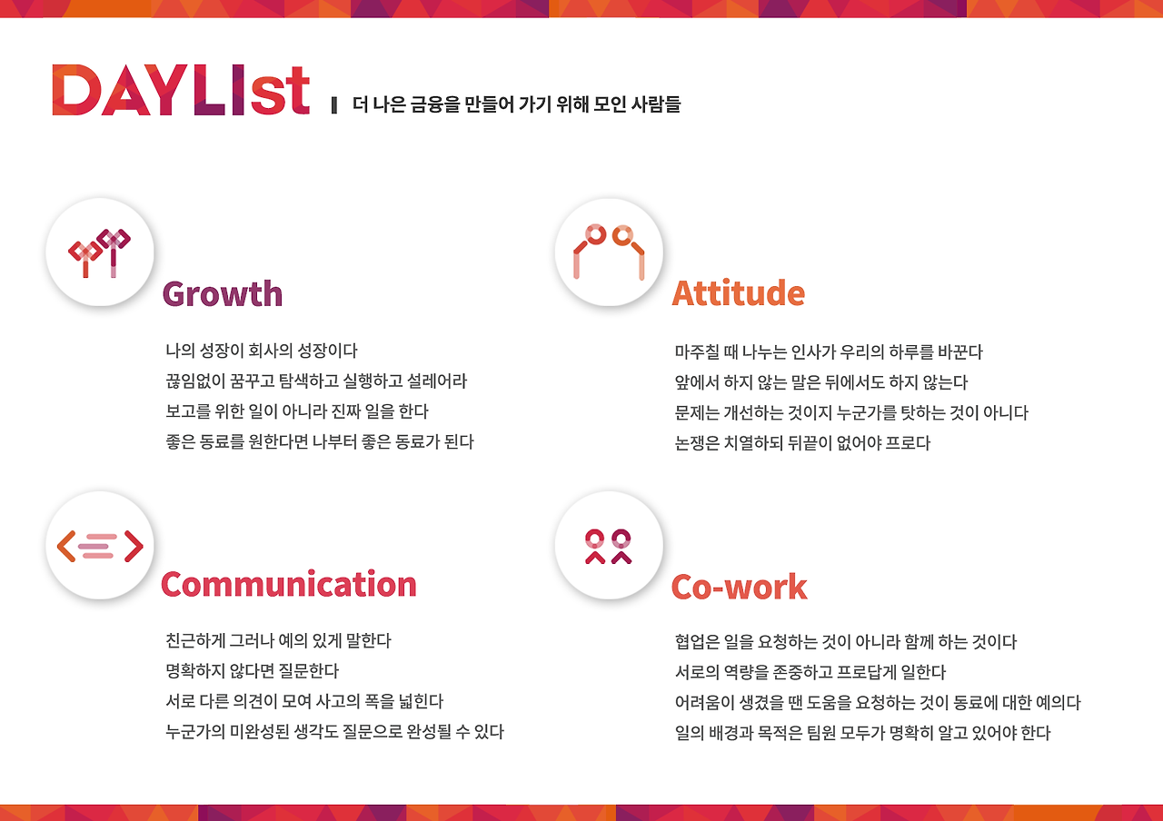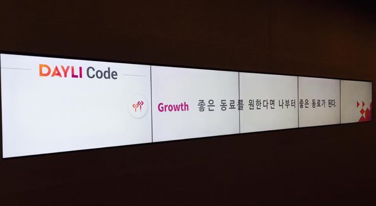 데일리의 'Community Values'입니다. 성장, 태도, 커뮤니케이션, 협업이라는 네 가지 키워드 하에 각 네 가지씩의 사고 원칙이 있는데, 1일 1코드의 형태로 미디어월에 노출되고 있습니다.