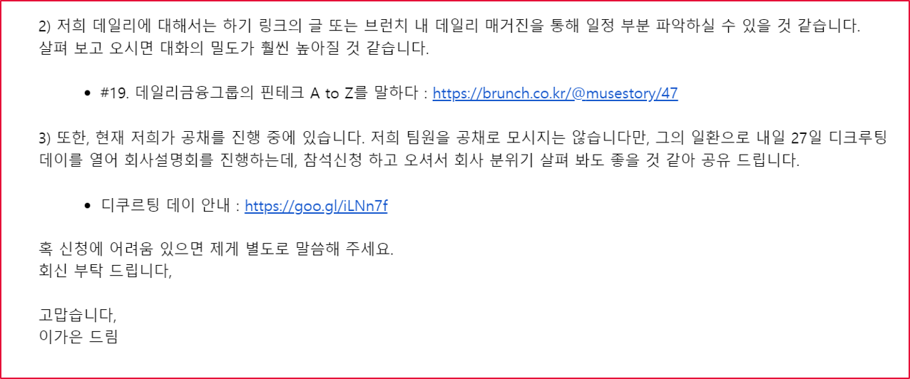 또 오픈하우스로 진행하다 보니 근무환경을 직접 볼 수 있는 게 좋았고, 행사 담당자들의 모습이나 선배와의 만남이라는 세션을 통해 자연스럽게 회사 분위기나 기업문화를 가늠해 볼 수 있어 데일리에 조금 더 적극적인 관심이 생겼구요.