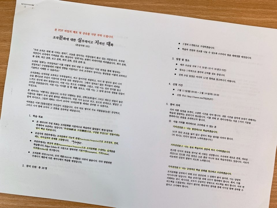 지난 해 2월, 김성준 박사님이 개설한 문실지대(조직문화에 대한 실무적이고 지적인 대화) 클래스에 참여한 적이 있다. 대기업, 중소기업, 스타트업에 소속한 경영진 또는 실무진 약 20명이 모여 16주간 조직문화에 대해 고찰하고 토론하는 것이 골자였다.