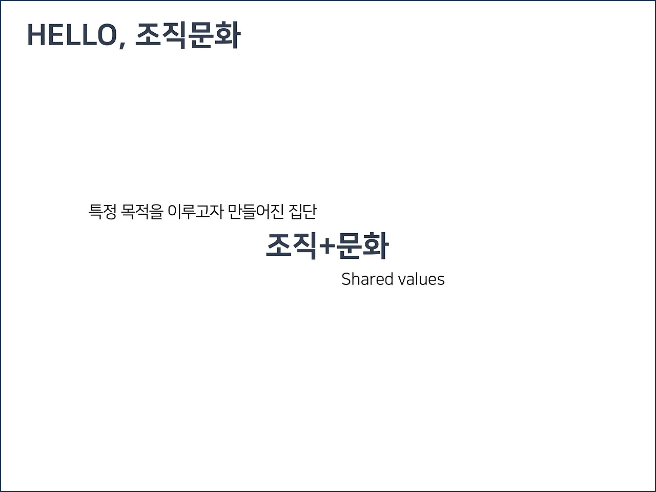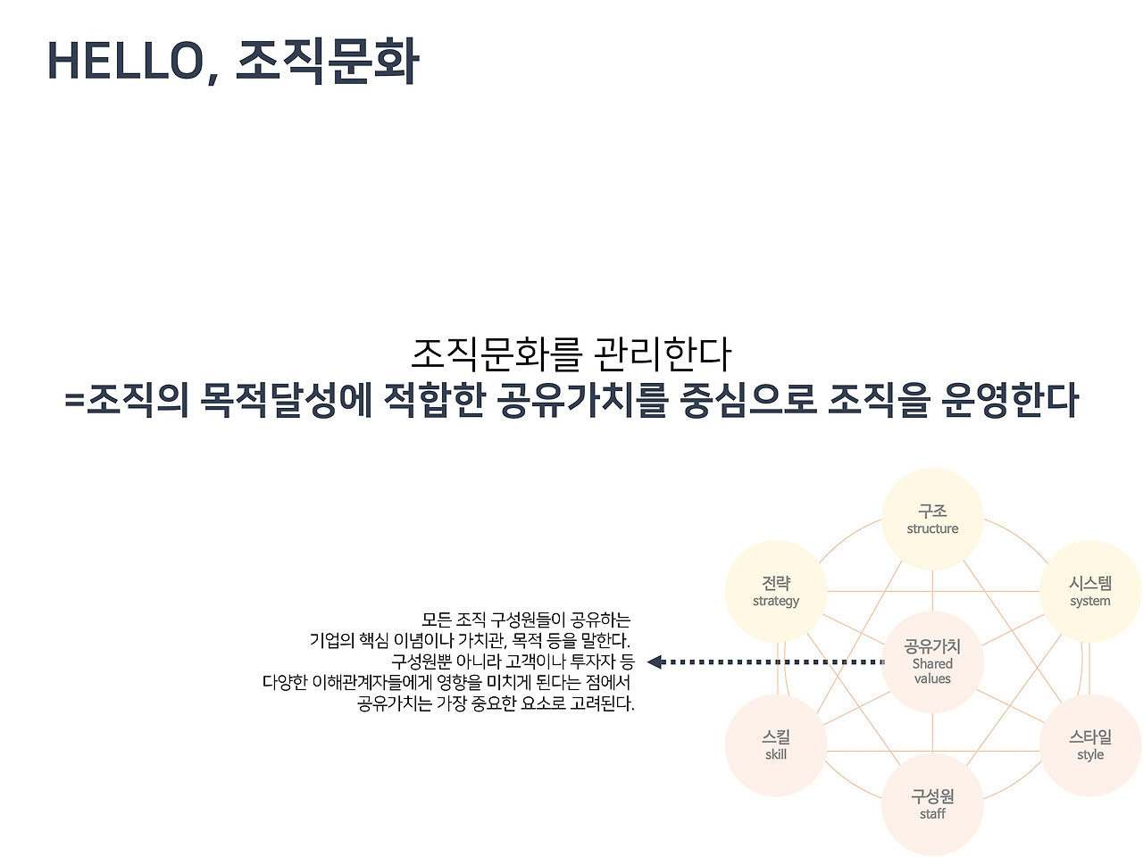 정리해보면 조직문화는 해당 조직이 특정목적을 달성하기 위해 공유하고 있는 가치, 거기서 파생된 여러 생활양식들을 총망라한 단어다.