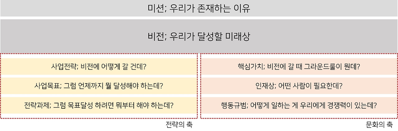 다시 말해 조직문화를 관리한다는 것은 무작정 어떤 트렌드를 따르거나 사치스러운 일을 하는 것이 아니라, 조직의 미션/비전 실현을 위해 조직을 전략적으로 운영한다는 것과 같은 말이다.