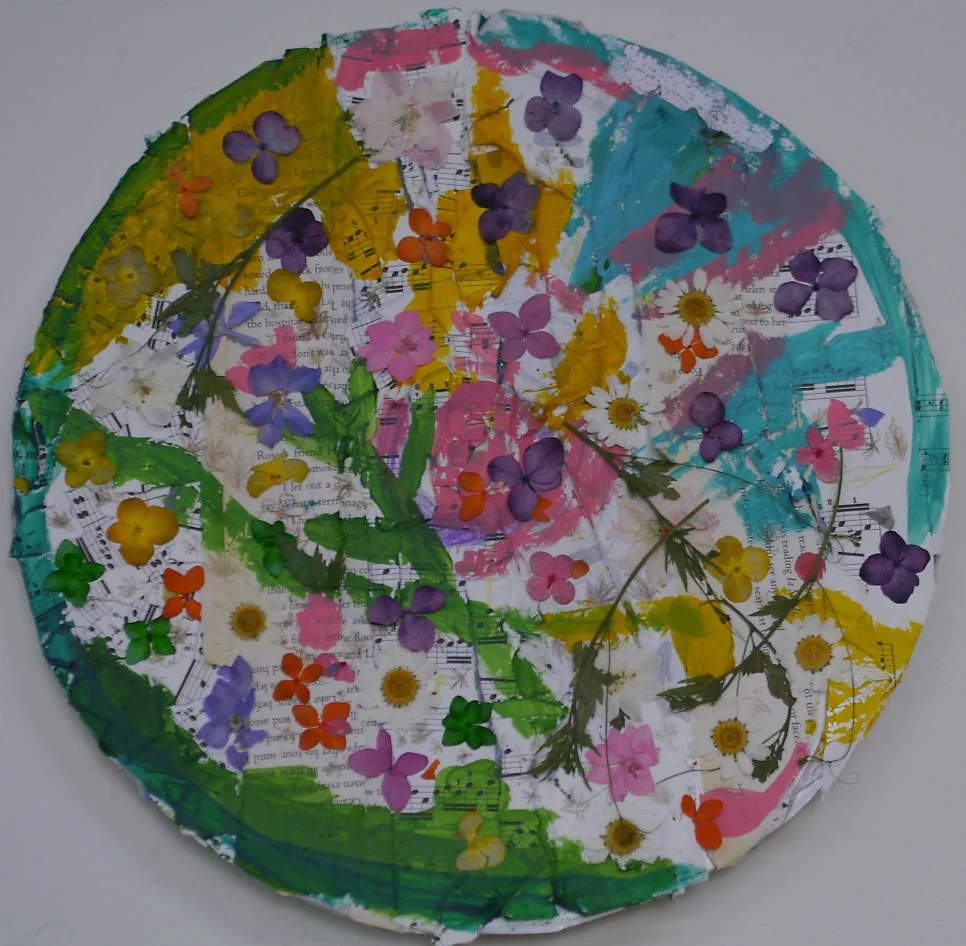 이 작품은 <봄의 노래>이다. 해묵은 책꽂이의 베토벤 악보를 찢어 붙이고 꽃잎을 눌러 붙이는 꼴라주로 이처럼 아름다운 작품이 탄생했다.