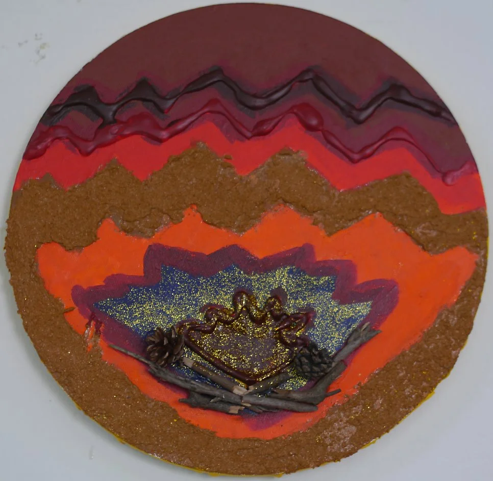 이 친구는 다름아닌 열받았을 때! 를 표현했다. 모닥불의 형상과 느낌을 표현했는데 성에 차지 않았는지 정말 불을 피우는 것처럼 나뭇가지와 솔방울을 주워와서 모닥불 아래 글루건으로 하나씩 붙여서 표현했다.