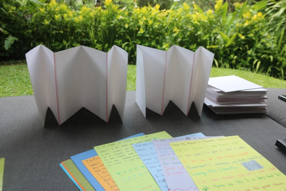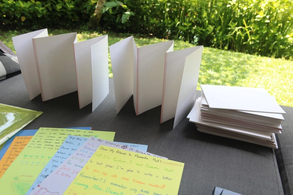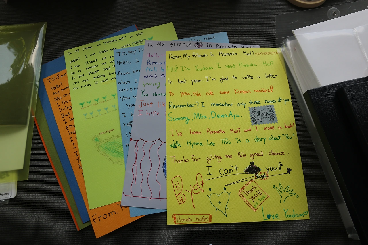 [독립출판으로 어린이작가 그림책 만들어주기]에 마음을 쏟기로 마음먹고 지금까지 60권이 넘는 그림책을 아이들과 함께 만들었다. 나는 이 책들을 만드는 과정에서 너무나 전율하다가 이따금 이런 생각이 들었다. 이 책을 쓰고 그린 아이 자신에게 이 책은 너무나 반짝이는 빛이 난다. 또 지도한 입장에서 내게도 너무나 소중하게 빛이 난다. 하지만 '애들이 쓴 거 뭐 별거 있겠어'하는 어른들이 볼 때는 아무런 빛이 보이지 않을 수도 있겠다. 나의 호들갑같은 이 전율이 별다른 감동이나 공감을 얻지 못할수도 있겠다. 아이가 해낸 표현 하나 하나에 전율하고 흥분하여 어쩔줄 몰라 벅차오르는 이 마음이... 그다지 오롯이 전해지지 않을 수도 있겠다. 이런 생각들로 이따금 마음이 쓸쓸해지기도 했었다. 그런데, 뜻밖에 생각지도 못했던 이곳 우붓에서, 원장님 아유가, 나의 이 마음을 오롯이 느껴주고 공감해주었다. '애들이 쓴 거, 거기에 뭔가 있다'는거 나도 안다고. 그리고 여기 인도네시아에서는 내가 선생님께 편지를 썼지만- 그곳 한국에서는 교실에서 아이들이 만들어낸 결과물들을 'just nothing' , '그저 아무것도 아닌 것'으로 여기지 않아주어 참 고맙다고. 그렇게 뜻밖에 내게 부어준 격려와 공감에 나는, 정말이지 눈물나게 가슴 벅차고 행복했다.