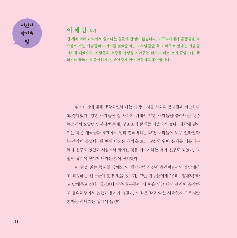 이 책을 아이들에게 읽어줄 때마다 가슴에 무거운 돌을 얹은 것처럼 답답했다. 어린이작가 이혜빈은 사람이란 식물과는 달리 약육강식을 떠나 그 자체로 존중받아야 하는 존재라고 말한다.