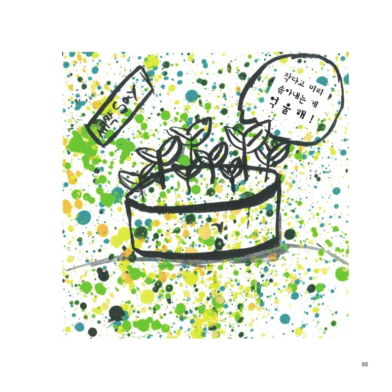 뽑혀져 나가는 작은 새싹에는 소심한 아이의 모습이 투영되어 있다. 입시와 취업의 경쟁에서 도태될까봐 잔뜩 웅크린 아이들은 이 작은 새싹에 공감한다. 지금은 작게 웅크린 어깨라고 해도 자리를 박차고 일어나 날갯죽지를 활짝 펼쳤을 때 얼마나 높이, 멀리 날 수 있을지 아무도 모른다. 한 아이가 가진 잠재력은 함부로 속단할 수 없다. 지금 작다는 이유만으로 자신의 잠재력에 기회를 부여받지 못하고 일찍부터 뽑혀져 나가는 새싹은 억울하고 슬프다.