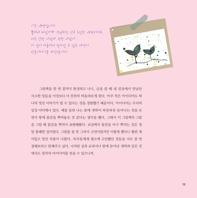 사람들이 자신을 분명 ‘약하다고 뽑아낼’ 것 같아 두렵다고 말하는 아이, 그리고 다 자라기도 전에 뽑혀져버릴까 조급한 마음에 쫓기듯 영양분을 먹고 자라려는 아이, 매일 교실에서 마주하는 우리 아이들이 들려준 이야기다. 그 새싹들이 뽑히지 않기 위해 몸부림치고 있을 이 가정과 교실, 사회 구석진 그늘에 마음이 어른거린다.