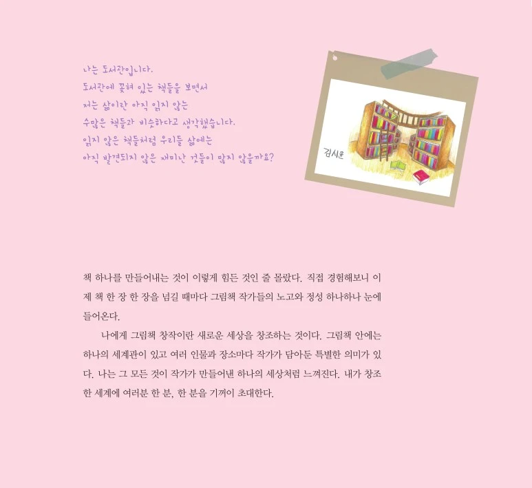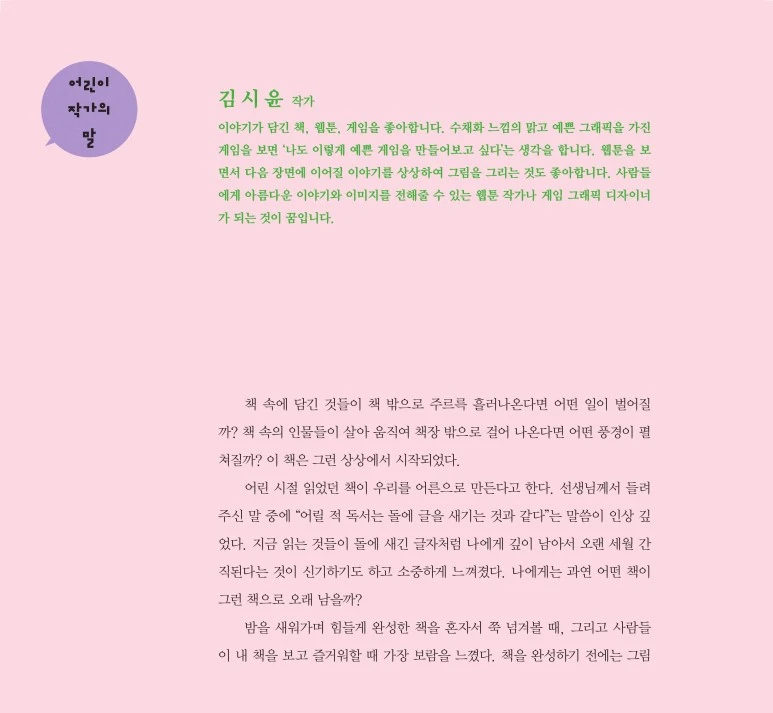 어린이작가 김시윤에게 그림책 창작이란 새로운 세상을 만들어내는 것이다. 그림책 안에는 하나의 세계관이 있고 여러 인물과 장소, 의미들이 담겨 있다. 그녀는 그 모든 것이 작가가 창조해낸 하나의 유일한 세상처럼 느껴진다고 말한다. 책 속에는 작가가 창조해낸 하나의 세상이 펼쳐져 있다. 그 세상에 빠져들어 나만의 세계를 만들어가는 시간은 나의 취향과 마음의 밑천을 만들어가는 시간이다.