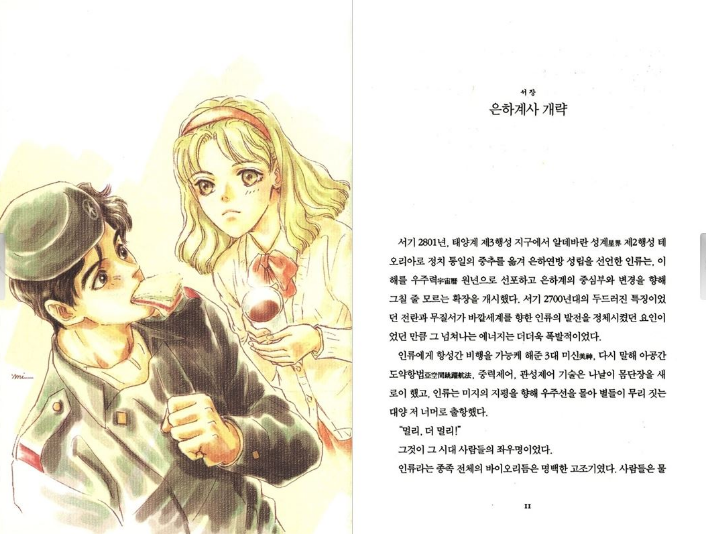 괴담에 가까운 영웅담들을 접하며 나는 <은하영웅전설>이라는 책이 실로 영웅적인 작품인가보다 생각하게 됐다. 그토록 대단한 소설이라면 읽어서 손해볼 것은 없지 않은가. 그리하여 책을 빌렸다. 책의 커버는 과연 멋스러웠다. 검은 양장에 은박으로 쓰인 '여명편', '비상편' 등 권마다 붙은 소제목도 웅장했다. 그러나 고풍스러운 책 커버를 넘기자, 갑자기 성인용 캔디같은 일러스트가 튀어나왔다.
