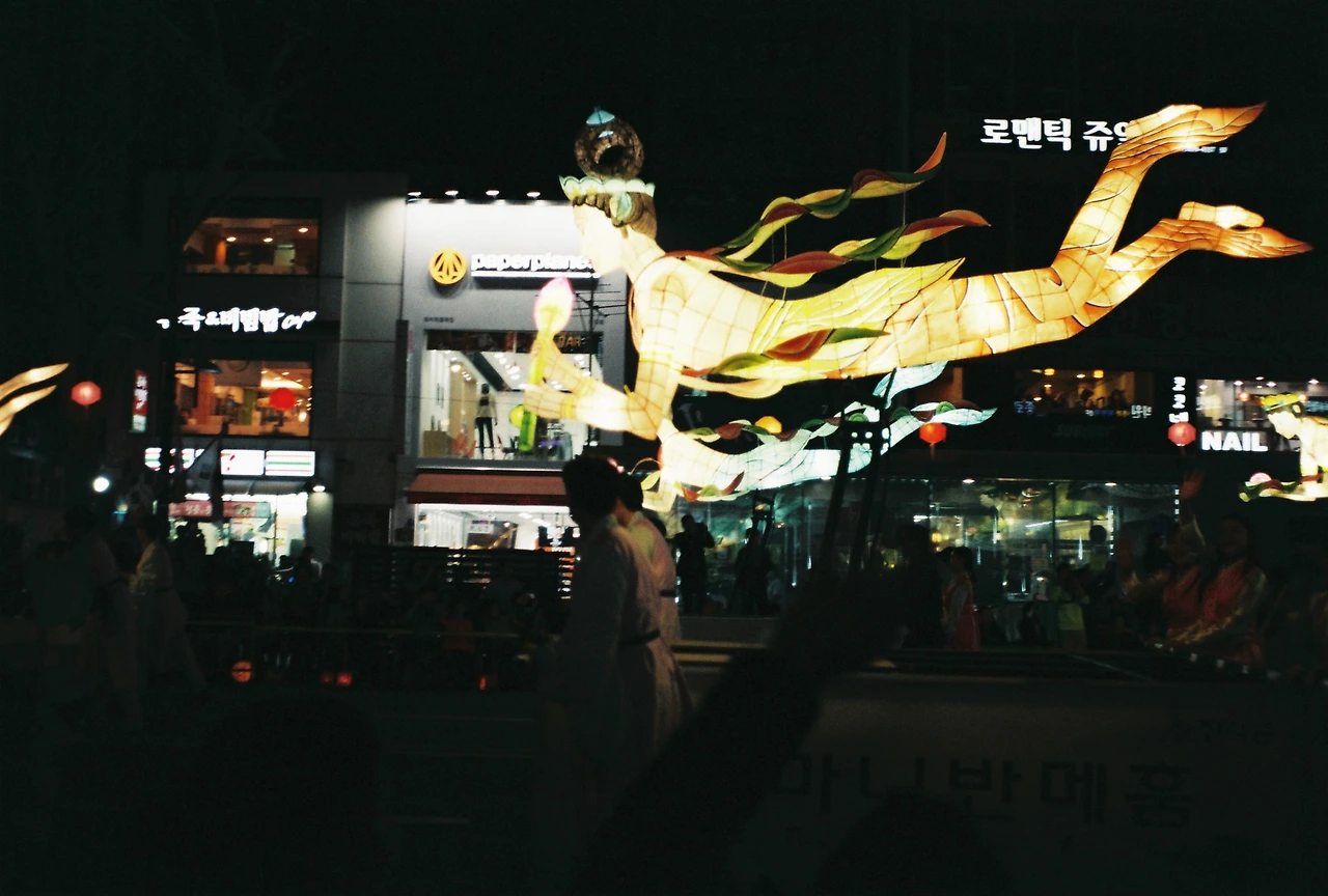 밤이 되자, 종로 거리에 관세음보살이 내려왔다. 하얀 코끼리도, 봉황도, 부처님도 걸어 다녔다. 카메라를 샀더니 찍을 게 생기네. 첫 카메라 선물은 낯선 종로구나.