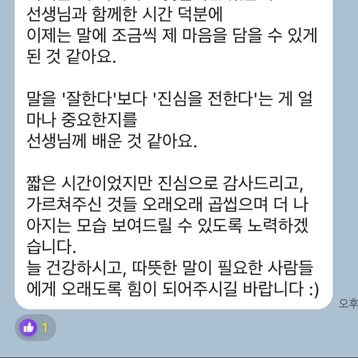 ’ 말을 잘하는 법보다 진심을 전하는 법을 선생님께 배운 것 같아요. 따뜻한 말이 필요한 사람들에게 오래도록 힘이 되어주세요.‘