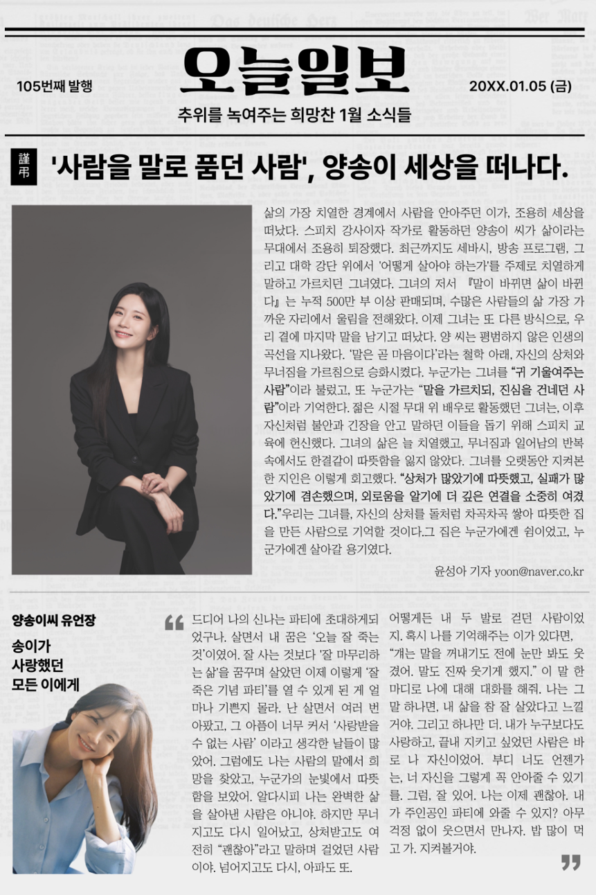 함께 일하는 강사님이 던진 말이었다. 호기심에 귀를 기울였다. 살아 있는 동안 자기 삶의 끝을 미리 써본다는 건 어떤 감정일까. 그녀의 말속에는 한 사람의 삶이 온전히 건강하게 완성된 느낌이 담겨 있었다. 마지막을 아름답게 준비한 사람에게서만 느낄 수 있는 향기가 피어났다. 그래서 그날 밤, 나도 조용히 내 부고 기사를 써보기로 했다.