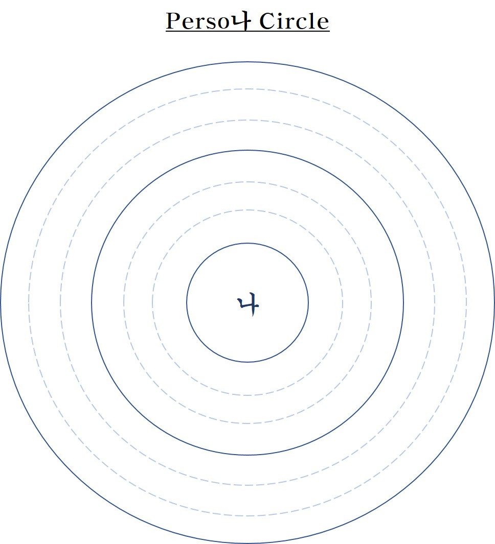 '페르소나 써클' 이라고 부르는 도구입니다. 가운데 '나(self)'가 있습니다. 당신이 찾은 역할들은 현재 당신에게 얼마나 중요한 역할인가요? 당신의 인생에 얼마나 큰 비중을 차지하고 있고, 얼마나 깊숙이 개입되어 있나요? 당신이 맡은 역할들은 당신과 얼마나 중요하게 연결되어 있나요? 현재의 '중요', '비중', '개입'의 정도를 기준으로 아래와 같이 표현해 볼 수 있습니다. 나로부터 가깝게 위치한 역할은 보다 중요하고, 비중이 크고, 삶에 깊숙이 개입되어 있는 역할입니다. 나로부터 거리가 멀수록 반대 의미를 갖는 역할입니다.