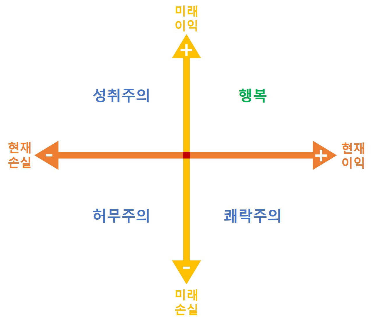 하버드 대학교 탈 벤 샤하르 교수가 <해피어>라는 책에서도 소개한 '행복사분면'입니다. 우리가 하는 선택은 행복사분면에 따라서 네 가지 경우로 나눠볼 수 있습니다. 어떤 선택은 현재에만 이익이 될 뿐 미래에 손실을 가져옵니다. 반대로 현재에는 이익이 안되지만 미래에 이익이 되는 선택도 있죠. 현재와 미래 모두 이익이 되지 않는 선택은 최악의 경우일 겁니다. 가장 좋은 선택은 현재와 미래 모두 이익이 되는 선택입니다. 결국 현재에도 이익이 되고, 미래에도 이익이 되는 선택을 많이 할수록 인생이 행복해진다는 것이 핵심입니다.