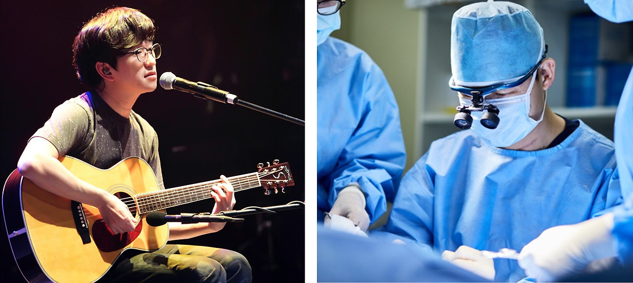 뮤지션과 의사죠. 어느 쪽이 더 끌리세요? 뮤지션 1번, 의사 2번, 하나 둘 셋! 그렇군요. 이번에도 선택한 이유를 설명하기 어려울 수 있어요. 둘 다 느낌이 너무 다른 직업이죠? 사진 속의 주인공들은 둘 다 선생님 친구예요. 왼쪽은 장기하와 얼굴들에서 기타를 쳤던 이민기 군이랍니다. 오른쪽은 정형외과 의사 백정국이라는 친구예요. 선생님 친구들도 참 다양한 분야에서 일하고 있어요. 국민건강보험공단이라는 공기업에 다니는 친구, LG전자, 삼성중공업에 다니는 친구도 있고, 호주로 건너가서 스프링클러 회사의 임원이 된 친구도 있어요. 저는 여러분 앞에서 이렇게 강의하는 코치이자 배우로 활동하고 있죠. 이렇게 다양한 일들 중에 각자 끌리는 분야가 있을 거예요. 선생님 친구들도 물론 그랬답니다.