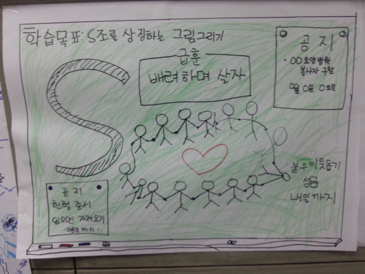 자, 그럼 여러분은 여러분이 모인 방을 잘 나타내 주는 그림 간판을 만들어 볼 거예요. 같이 모인 친구들끼리 어떤 그림으로 표현하면 좋을지, 여러분의 방과 활동을 잘 나타내 주는 그림을 그려보겠습니다.