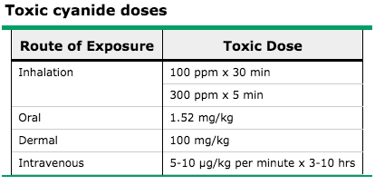 순수한 청산을 경구로 먹었을 때 독 용량은 생각보다 낮다. 체중당 1.52 mg. 청산이 맹독이라 불리는 이유다. 리지의 계산대로 150 mg이라면, 100 kg의 거구도 너끈히 쓰러뜨릴 수 있는 양이지만, 청산은 청산 수화물. 칼륨이나 나트륨 염기가 붙은 채로, 존재한다. 즉 청산칼륨 150mg은 청산 150mg은 아닌 것이다. 또 수율(순수한 원료 얼마를 추출할 수 있는지)이나, 경구 흡수율, 생체이용률과 같은 개념을 더 해 생각해보면, 먹은 대로 다 흡수되는 건 아니라는 걸 알 수 있다.