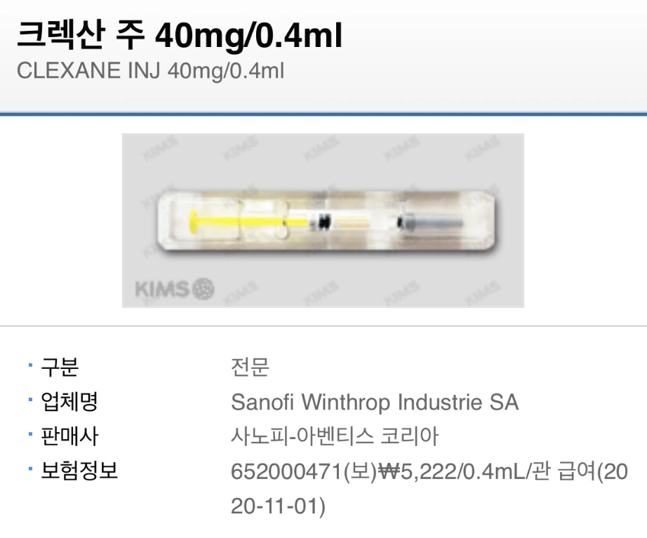 그리고 하나의 약물을 더 추가하는데, 저분자량 헤파린(LMWH, Low Molecular Weight Heparin)인 에녹사파린이다. 에녹사파린은 제네릭(generic)이 출시되어 다양한 회사에서 공급하지만, 오리지널은 사노피아벤티스 사에서 출시한 크렉산으로 주사제다. 은지의 경우, 스스로 주사할 수 없지만, 프리필드 제형으로 이를 자가주사 형태로 처방받아 마치 인슐린 펜처럼 직접 주사하기도 한다.