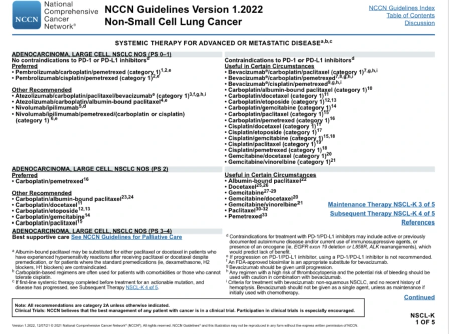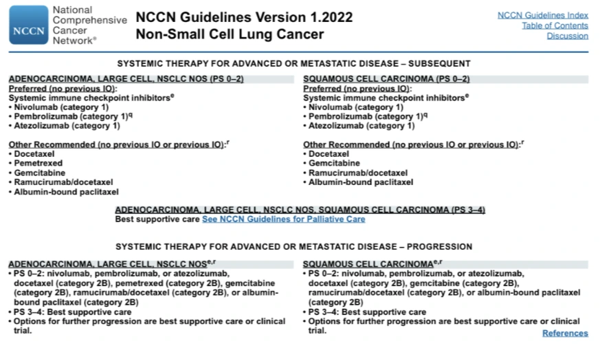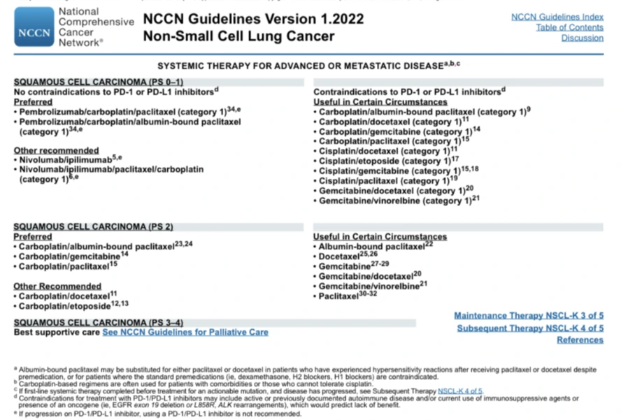 편평 세포암의 경우는 면역항암제 중 티센트릭(아테졸리주맙)이 권고되지 않으며, 앞서 언급한 대로, 알림타의 효과를 보이지 않는 군이라, 알림타가 치료 옵션에서 빠지는 것이 대표적 변화이며, 아바스틴 또한 편평 세포암종에서는 효과를 입증하지 못해, 편평 세포암에서는 쓰이지 않는다.