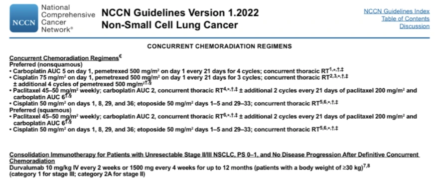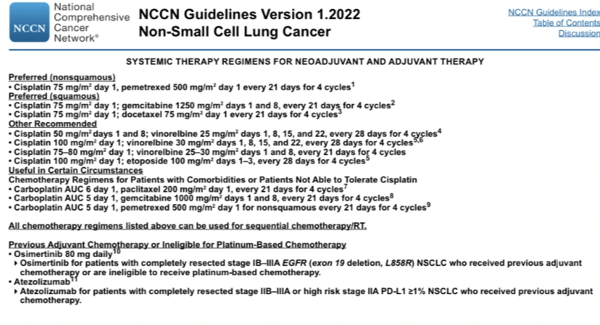 그 외에 내가 한창 임상약사로 일하던 시절에 선호되던 Day 1&8에 각 방문해, 씨스푸란과 나벨빈(비노렐빈)을 투여받는 방법도 있고, 이의 변용인 4주 주기 요법도 있다. 소세포 폐암에도 쓰이는 EPS(에토포사이드)를 대신 투여하는 레지멘도 있다. 기본적으로 보조 및 신보조 요법에서 근간은 씨스플라틴이지만, 씨스플라틴에 금기인 경우, 이를 대신해 카프란(카보플라틴)을 투여하기도 하며, 카프란의 경우 곡선하면적을 기준으로 신기능에 따른 노출양을 산정해, 용량을 역산, 투여 용량을 정한다. 기준이 되는 AUC는 5 또는 6이다.