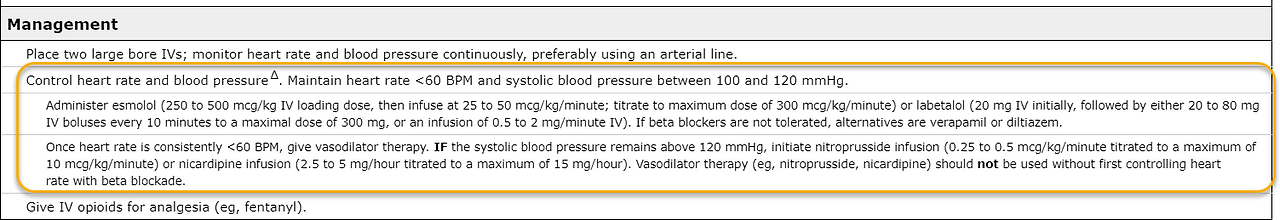 대동맥 박리 환자의 치료는 일반적으로 심박수를 분당 60회 이하로 줄이기 위해, 베타차단제를 투여하는 것으로 알려져 있다. 특히 급성기 치료의 경우, 김사부가 선택한 에스몰롤이 유용한데, 이는 짧은 반감기와 효과를 얻기 위한 증량이 용이하기 때문이다(투여 용량은 체중을 고려해 결정되며, 250 to 500 mcg/kg를 부하용량, 즉 초기 loading dose로 1분 이상에 걸쳐 투여 후, 1분 당 25 ~ 50 mcg/kg를 점적 주입할 수 있다) 특히 에스몰롤은 천식 또는 심부전 등과 같이 기존 베타 차단제에 불응한 환자에도 유용하게 투여할 수 있다는 장점이 있다.