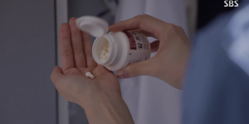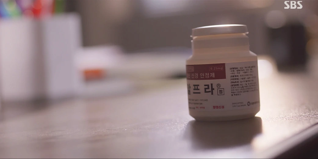 드라마의 후반이 되면, 그녀의 사연 역시 곧 풀어지겠지만, 현재로서는 수술을 앞두고 "차은재, 들어와"란 말 앞에 안절부절못하다 못해, 탈의실에서도 한참을 망설이다 아무도 없는 것을 확인하고서 사물함을 연다. 이때 클로즈업된 사물함 안에서 눈에 띄는 약병, 바로 알프라졸람이다.