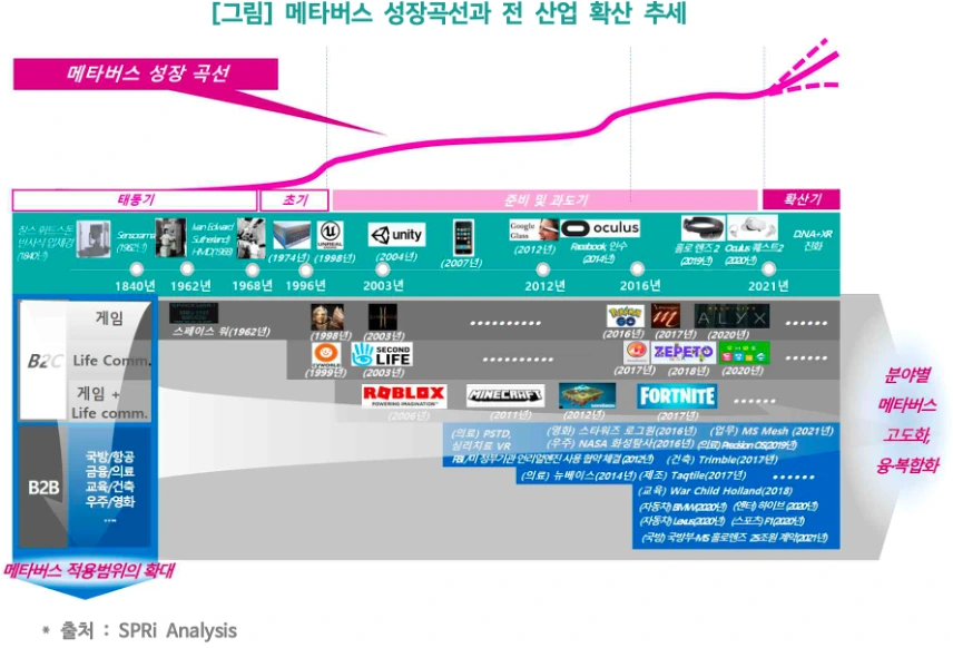 현재 콘텐츠 시장에서 주목받는 키워드는 ‘메타버스'이다. Google Trend 기반 SPRi Analysis에 따르면 2021년부터 ‘메타버스’ 검색 양이 급속하게 증가했으며, MS, 애플, 네이버, 카카오 등 국내외 내로라하는 빅테크 기업들이 메타버스 사업에 뛰어들기 시작했다. 아래 그림에서 알 수 있듯이, 메타버스 성장은 상향 곡선을 그리고 있으며 적용범위 역시 나날이 확대되고 있는 실정이다.