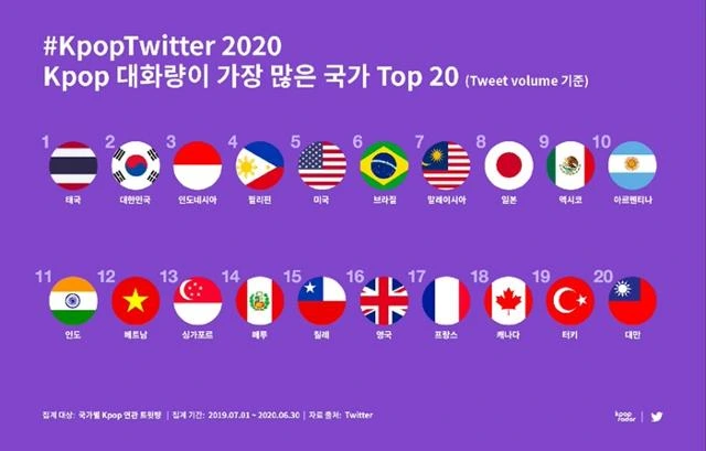 실제로 트위터(Twitter)가 조사한 KpopTwitter 2020에 따르면, 다양한 국가의 사용자가 케이팝을 이야기하고 있다.