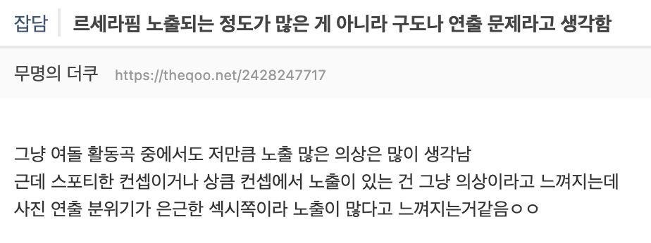 위와 같은 성애적 이미지가 ‘당당함’을 보여주는 요소로 작용될 수 있는 것은 맞다. 유명 팝 아티스트 뿐만 아니라 국내 솔로 가수들도 성애적 이미지들이 구성된 ‘섹시 콘셉트’로 주체적인 여성상을 보여주고자 한 기획의 사례도 다수 존재한다. 그러나 이들과 르세라핌의 차이점은 ‘미성년자 멤버들이 포함된 점’, 그리고 ‘멤버 본인의 주체적인 선택이 아닌 기획사가 만들어낸 이미지’라는 점이다.