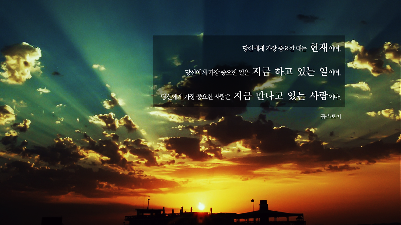 톨스토이의 명언입니다. 당신에게 가장 중요한 때는 현재이며, 당신에게 가장 중요한 일은 지금 하고 있는 일이며, 당신에게 가장 중요한 사람은 지금 만나고 있는 사람입니다.