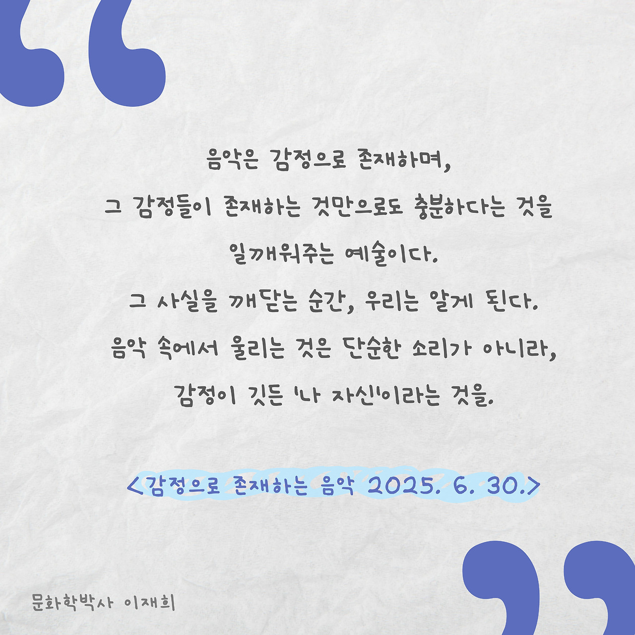 음악은 감정의 언어이다. 감정은 음악 속에서 흐름과 강약, 장단의 조절과 같은 구조를 따라 머물고, 때로는 흘러간다. 우리는 음악에 담긴 감정을 느끼며 교감하고, 더 나아가 그 감정 속에서 ‘나’의 흔적을 발견하기도 한다. 음악은 단순히 감정을 전달하고, 또 전달받는 수단이 아니라, 그 감정을 내 안에서 살아 움직이게 만드는 예술인 것이다. 그렇게 우리가 음악을 듣게 되는 순간의 감정은 더 이상 ‘남의 것’이 아니게 된다. 음악에 담긴 감정은 ‘나의 감정’이 되고, 그 감정을 따라가는 여정은 우리가 단순히 음악을 듣는 행위를 넘어서 내면을 이해하고 성찰하는 여정으로 이어진다.