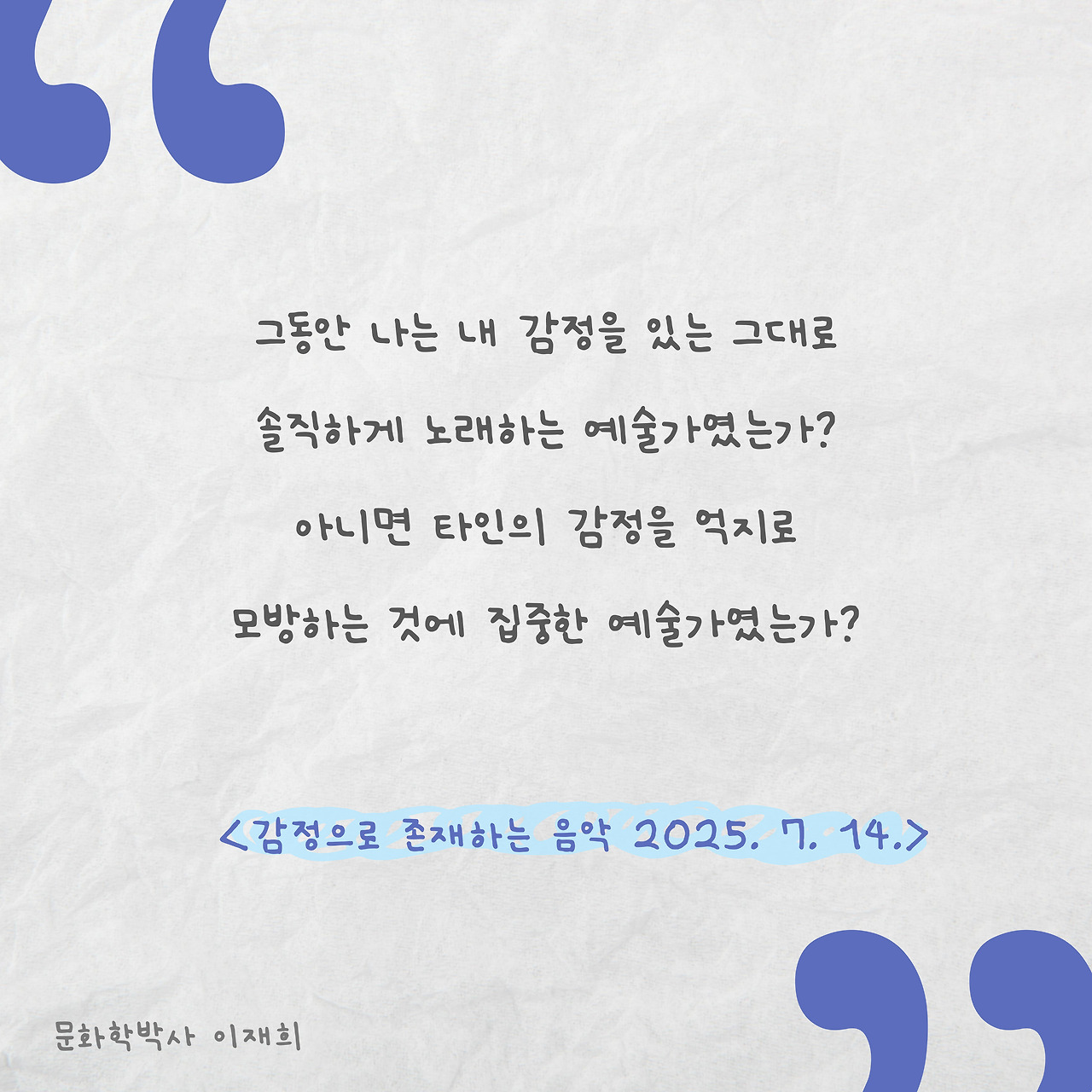 이 글의 화자인 나도 예술가로서의 나 자신에게 질문해 본다. 그동안 나는 내 감정을 있는 그대로 솔직하게 노래하는 예술가였는가? 아니면 타인의 감정을 억지로 모방하는 것에 집중한 예술가였는가?