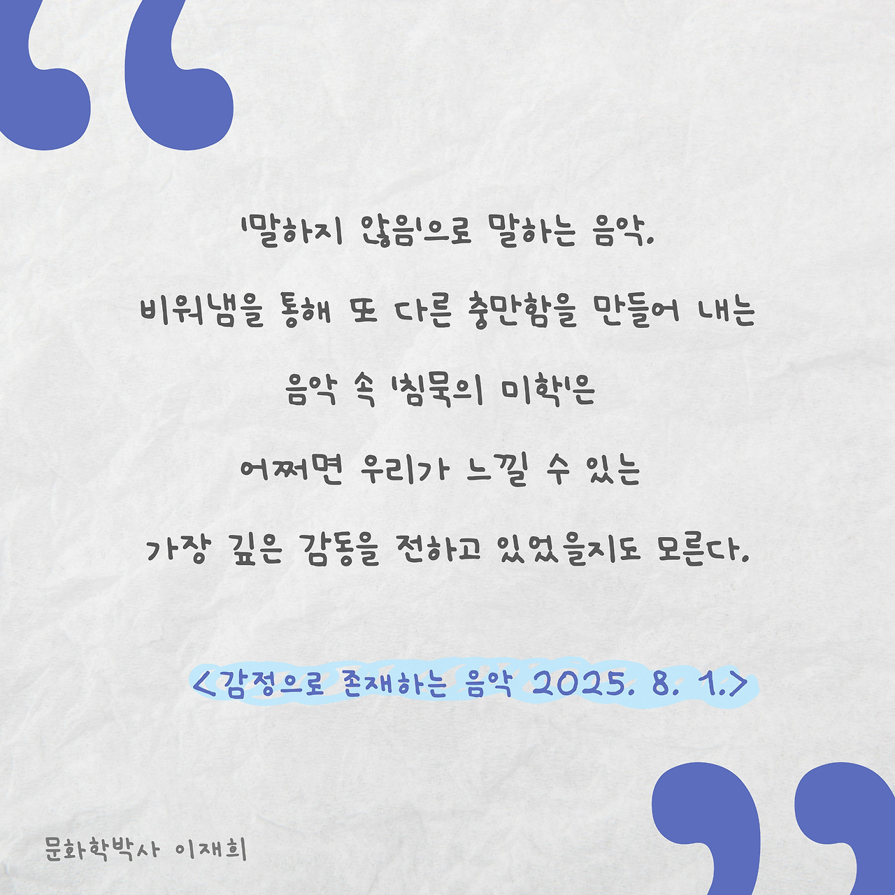 소개한 곡 외에도 이 앨범의 모든 수록곡이 같은 방식으로 작곡되었다. 그 곡들 역시 ‘말하지 않음’, 즉 ‘비워냄’을 통해 또 다른 ‘충만함’을 만들어 낸다. 그리고 그 ‘충만함’ 속에서 우리는 감정이 존재하는 음악의 힘을 다시금 경험하게 된다. 때로는 위로처럼, 때로는 혼자만의 고백처럼. 어쩌면 음악에 담긴 이 ‘침묵의 미학’은 우리가 느낄 수 있는 가장 깊은 감동을 전하고 있었을지도 모른다. 오늘도 그의 음악은 ‘말하지 않음’으로 우리에게 진실한 감정의 이야기를 끊임없이 건네고 있다.