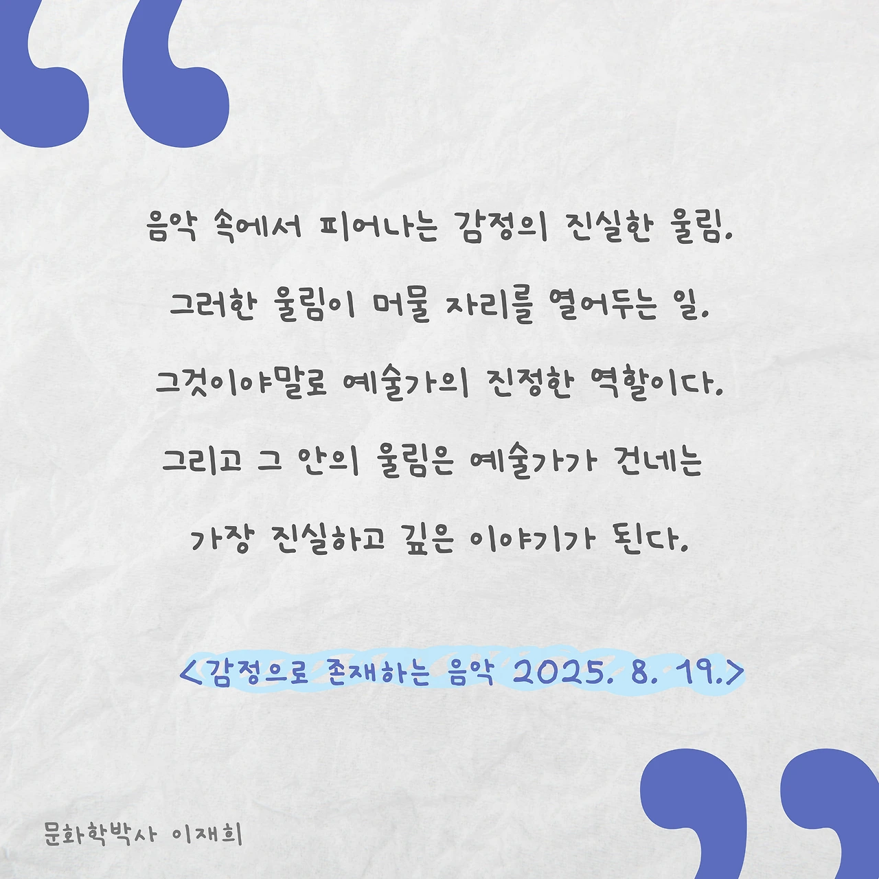 음악 속에서 피어나는 감정의 진실한 울림. 그 울림이 머물 자리를 열어두는 일. 그것이야말로 예술가의 진정한 역할이다. 그리고 그 울림은 예술가가 듣는 이에게 건네는 가장 진실하고 깊은 이야기가 된다. 오늘도 그녀의 음악은 감정의 결을 따라 유유히 흐르고 있다.