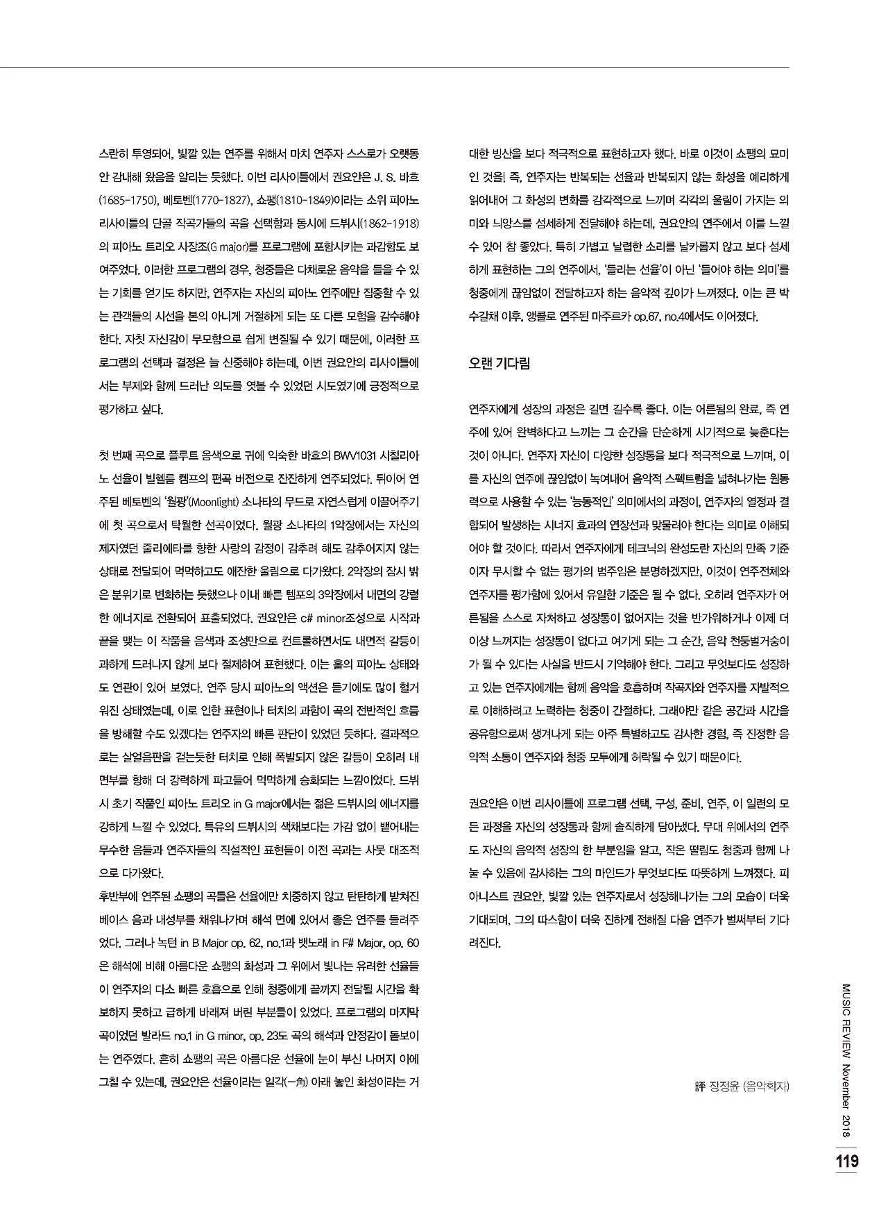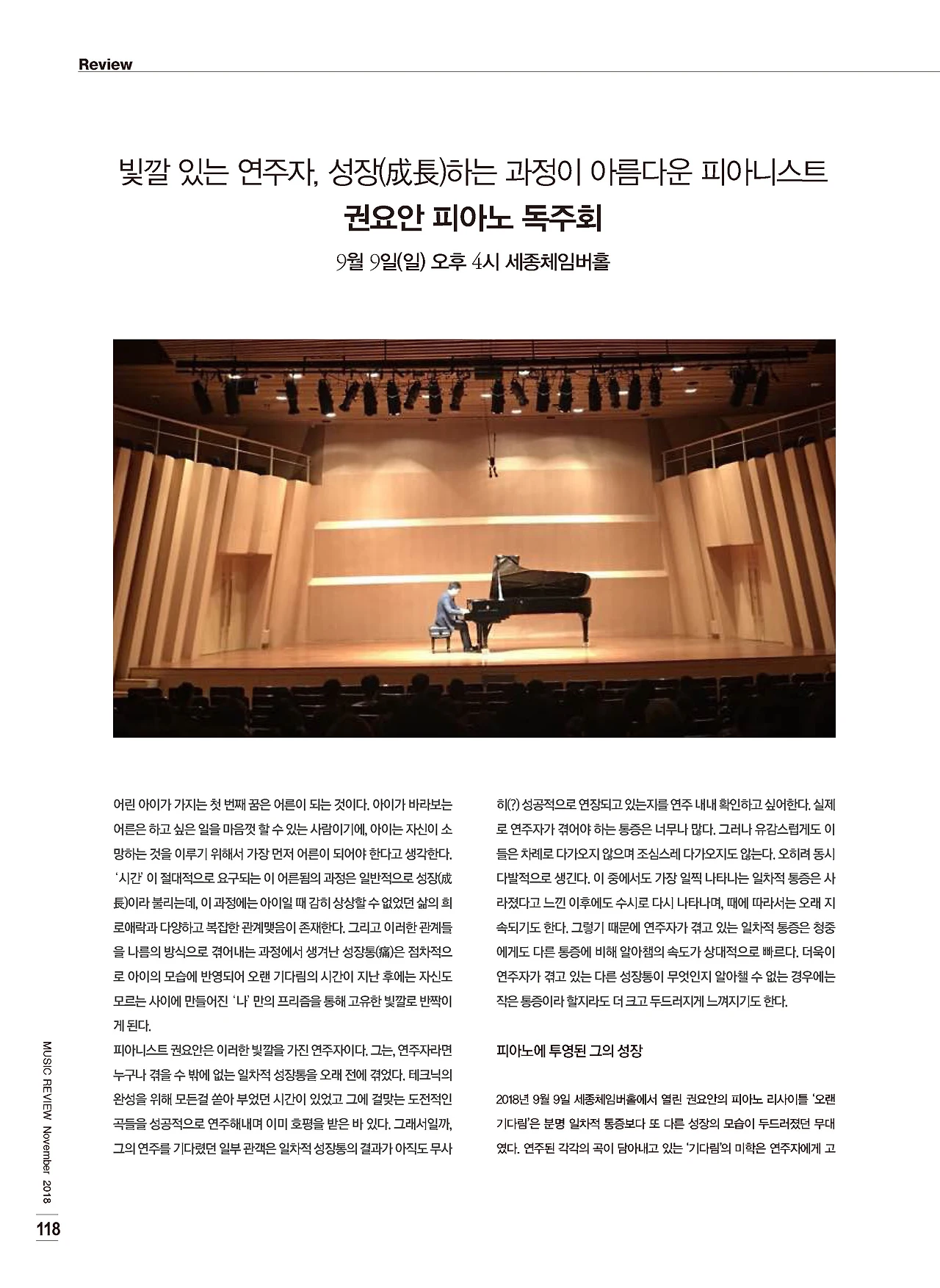 2018년 9월 9일 세종 체임버홀에서 열린 권요안의 피아노 리사이틀 ‘오랜 기다림’은 분명 일차적 통증보다 또 다른 성장의 모습이 두드러졌던 무대였다. 연주된 각각의 곡이 담아내고 있는 ‘기다림’의 미학은 연주자에게 고스란히 투영되어, 빛깔 있는 연주를 위해서 마치 연주자 스스로가 오랫동안 감내해 왔음을 알리는 듯했다.