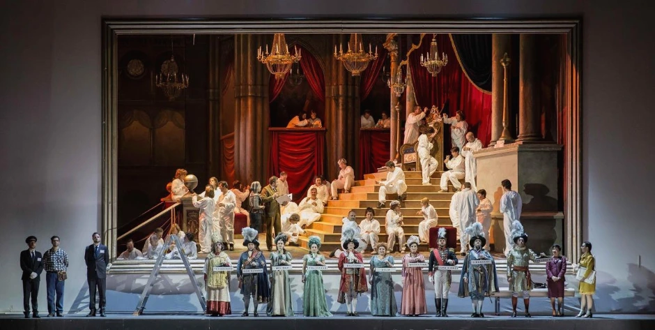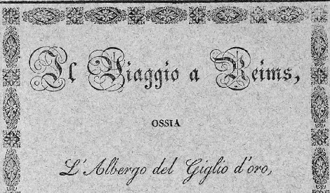-이탈리아어 제목은 '랭스로 가는 길 혹은 황금 백합이라는 여관에서'(Il Viaggio a Reims ossia L'Albergo del Giglio d'oro)라고 쓰여있는 것을 볼 수 있다.-