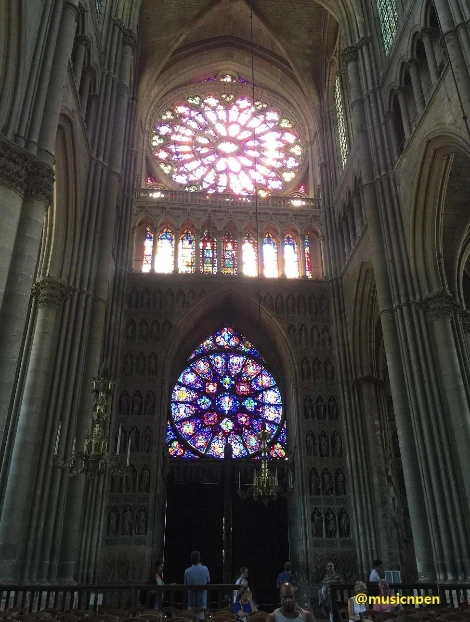 맨 위에 있는 동그란 장미 문양의 스테인드 글라스는 13세기 말에 만들어진 것으로, 가장 가운데 성모 마리아를 중심으로 12명의 사도가 둘러싸고 있고 그 주위를 24명의 천사가 주위를 감싸고 있는 모습이다. 그리고 아래의 장미 문양은 1차 세계대전 이후 1936년에 다시 만들어진 것으로, 가운데 역시 성모 마리아가 있고, 꽃잎들은 그녀의 여러 자질을 표현하고 있다. 이렇게 한쪽에 2개의 장미 문양이 크게 위치하고 있는 것은 매우 이례적이라고.