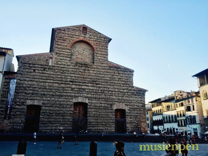 성 로렌초 성당은 산타 마리아 델 피오레와 북서쪽으로 도보로 5분도 채 되지 않은 아주 가까운 위치에 있다. 화려한 산타 마리아 델 피오레와는 다르게 성 로렌초는 외관이 아주 투박하고 밋밋한 모습을 보이는데, 15세기에 메디치 가문의 조반니 디 비치(Giovanni di Bicci, 1360-1429)가 조각가이자 건축가였던 부르넬리스키(Filippo Brunelleschi, 1377-1446)에게 11세기 양식으로 재건하도록 자금을 지원했지만, 그가 건물 정면 출입구 외벽인 파사드를 완성하지 못하고 세상을 떠났기 때문이다.