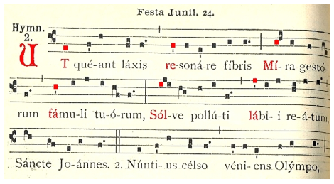 6개의 음을 나열한 헥사코드를 고민했지만, 음들을 뭐라고 부를지 고민하던 귀도는 라틴어 찬미가 "Ut queant laxis"의 가사에서 착안하여, 6개의 음에 붙이게 된다. 신기하게도 이 곡에서 'ut', 're', 'mi', 'fa', 'sol', 'la'는 한 음씩 올라가는 형태를 보이고 있지 않은가!