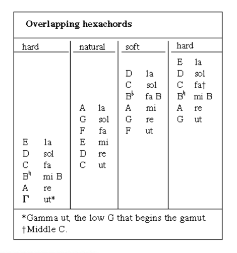 도(ut), 레(le), 미(mi), 파(fa), 솔(sol), 라(la)라는 6개 음으로 구성된 헥사코드 시스템은 오직 '미-파' 간격만 반음이었기 때문에 테트라코드보다는 6개 음으로 보다 확장적인 음역을 만들어 주면서도, 반음을 한 개 포함하는 코드 형태로서 움직임에 있어 예외를 최소로 줄일 수 있는 장점이 있었다.