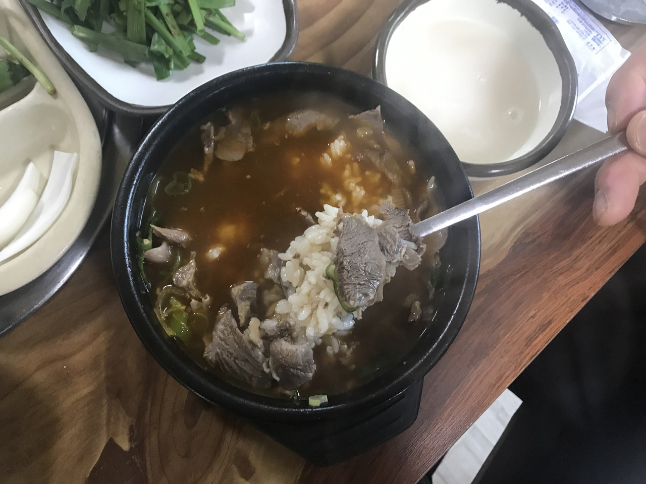 그랬던 내게 시험이 닥쳐왔다. 국밥이 정말 맛있기 때문이었다. 나는 돼지국밥을 시켰는데 예상과는 다르게 살코기만 있어 질기고 이 사이에 끼지 않을까 염려했는데 전혀 아니었다. 내 입맛에만 그런 것이 아니라 다른 동료들도 정말 맛있다고 말했다.