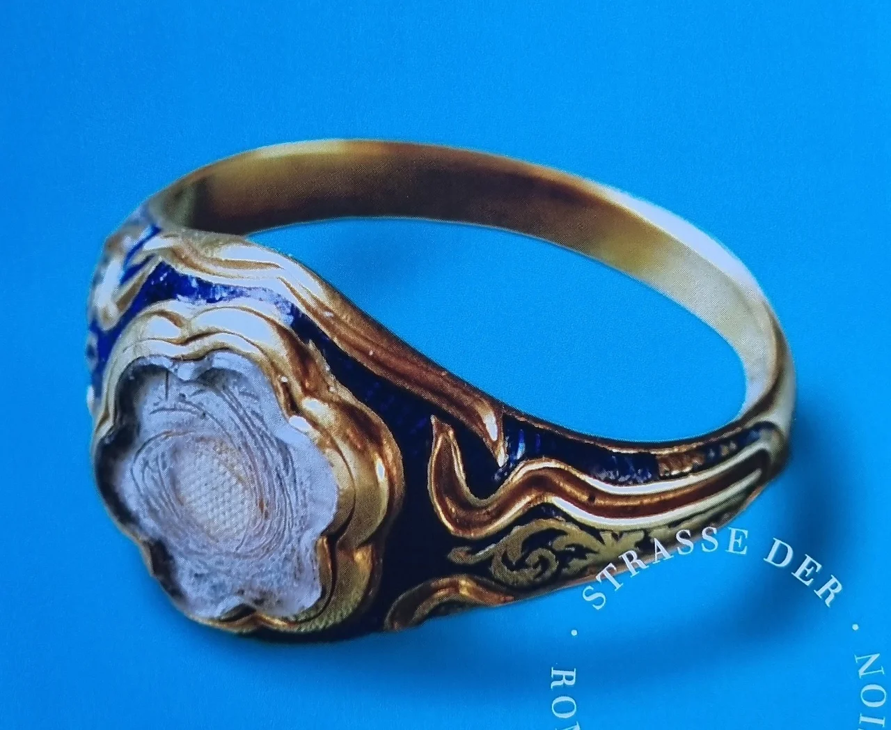 슈만박물관 홍보책자 속 멘델스존의 머리카락이 들어 있는 파란 에나멜 반지 사진.