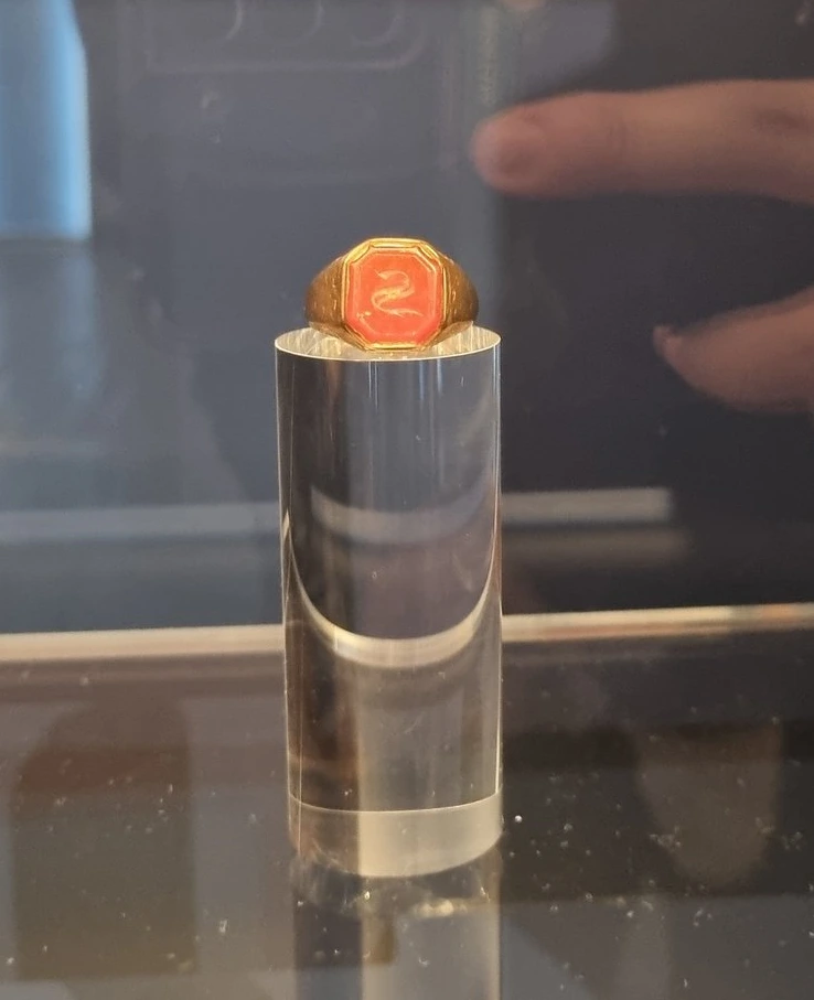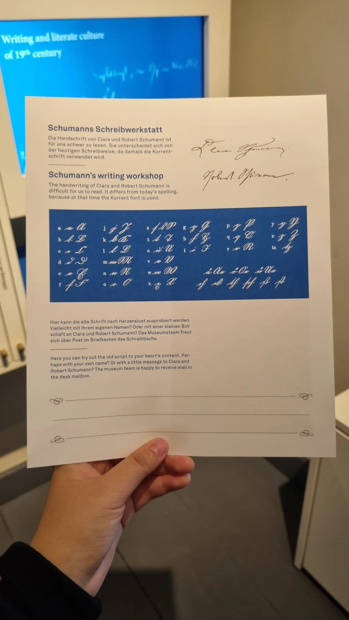 슈만의 책상은 진짜 책상은 아니다. 하지만 그렇다고 해서 책상 위 전시되어 있는 물건까지 진품이 아닌 것은 아니다. 다. 개인적으로 내가 슈만 박물관에서 무척 좋아하는 소장품 두 가지가 이 방에 전시되어 있는데, 하나는 슈만의 인장 반지고 다른 하나는 슈만의 노트다. 슈만의 인장 반지라고 하는 건.... 아트박스를 가면 있는 실링 왁스 들어봤는가? 편지를 봉할 때 왁스를 붓고 그 위에 도장을 찍어 모양을 낸 다음 왁스를 굳혀 편지를 봉하는 방식인데, 이 도장이 반지에 붙어 있는 것이다. 슈만에게도 이 인장반지가 있었다! 무려 결혼기념일날에 맞춘 선물이라고 한다. 미디어 스테이션에 가서 확인해 보면 인장반지, 책상 위의 잉크와 펜은 19세기에 어땠는지에 대해서도 자세히 설명해 준다. 작곡가 박물관에서 시대배경에 대한 이해가 부족하다면 재미가 크게 반감되곤 하는데, 그런 결점을 훌륭하게 잘 보완해 준 박물관이었다. 슈만이 하이네에게 보낸 편지 사본 등이 다양하게 전시되어 있어 시대배경과 슈만을 쉽게 연관 지어 볼 수 있다는 것이 큰 장점이다.